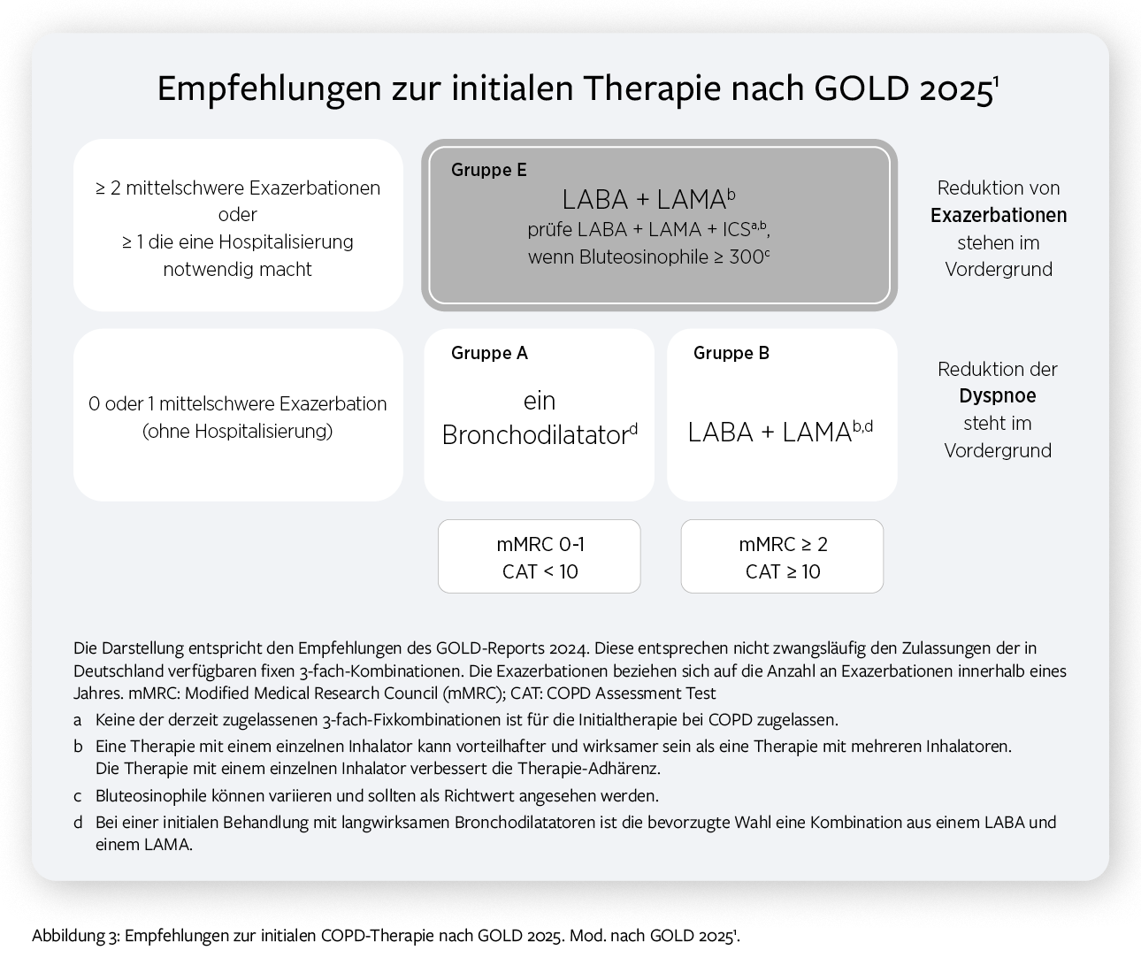 Die initiale Therapie gemäß GOLD 2025 orientiert sich an Symptomlast (nach CAT oder mMRC) und Exazerbationshistorie (Abbildung 3). Im ABE-Schema sollen Patient*innen entweder mit einem inhalativen Bronchodilatator (Gruppe A) oder einer inhalativen Kombinationstherapie aus LABA + LAMA (Gruppe B und E) behandelt werden. Bei Patient*innen in der Gruppe E und Bluteosinophilenzahlen ≥ 300 Zellen/µl sollte der Einsatz einer Triple-Therapie aus ICS+LABA+LAMA* geprüft werden.1,*