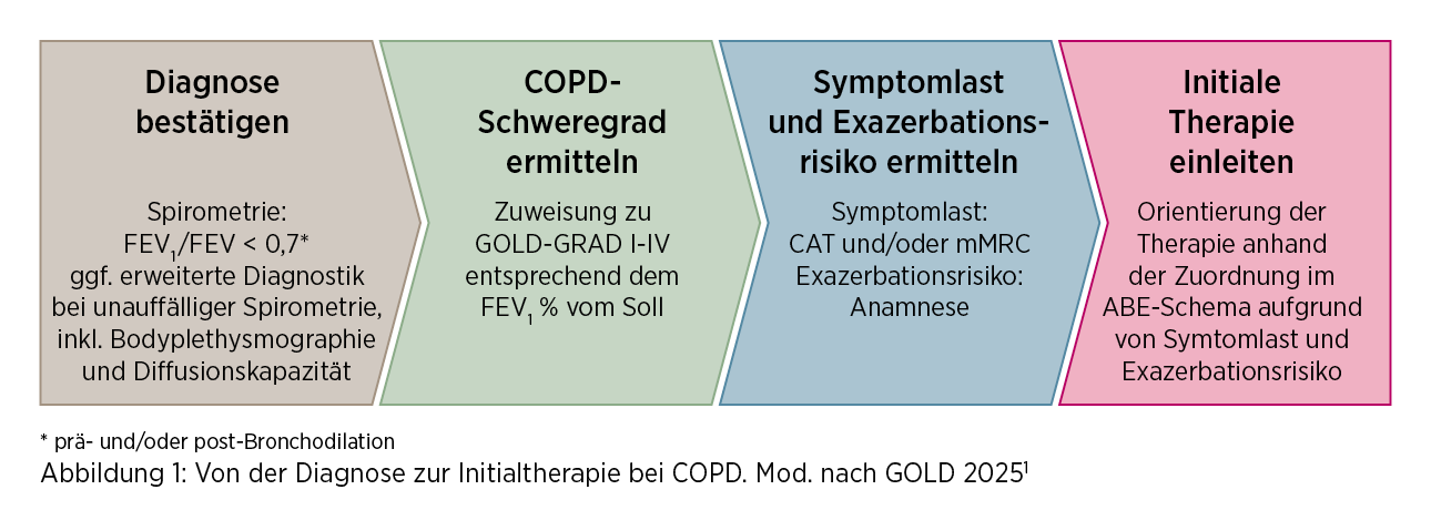 Der Grad der Obstruktion wird dann anhand der spirometrischen Kriterien in GOLD 1-4 eingeteilt. Die initiale Therapie richtet sich nach Symptomlast und Exazerbationsrisiko, entsprechend der GOLD Gruppen A, B und E (Abb. 1).1