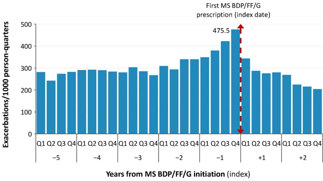 - Real-World-Daten zeigen: Bei unkontrollierten Asthmapatient*innen unter mitteldosierter ICS/LABA-Therapie sinkt die Exazerbationsrate signifikant und nachhaltig nach der Umstellung auf die extrafeine fixe Triple-Therapie mit BDP/FF/G* (Abb.2).10