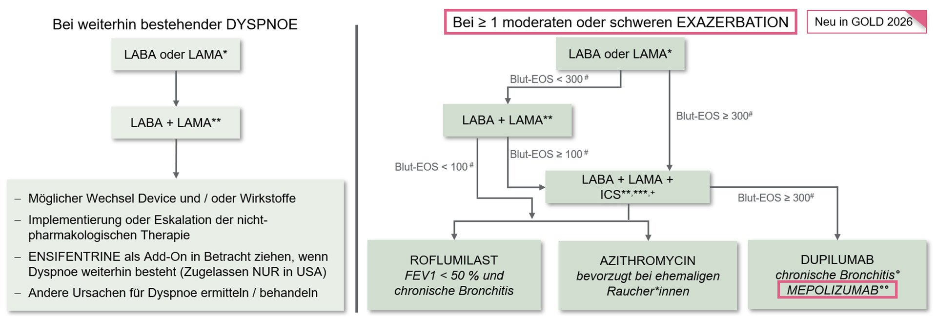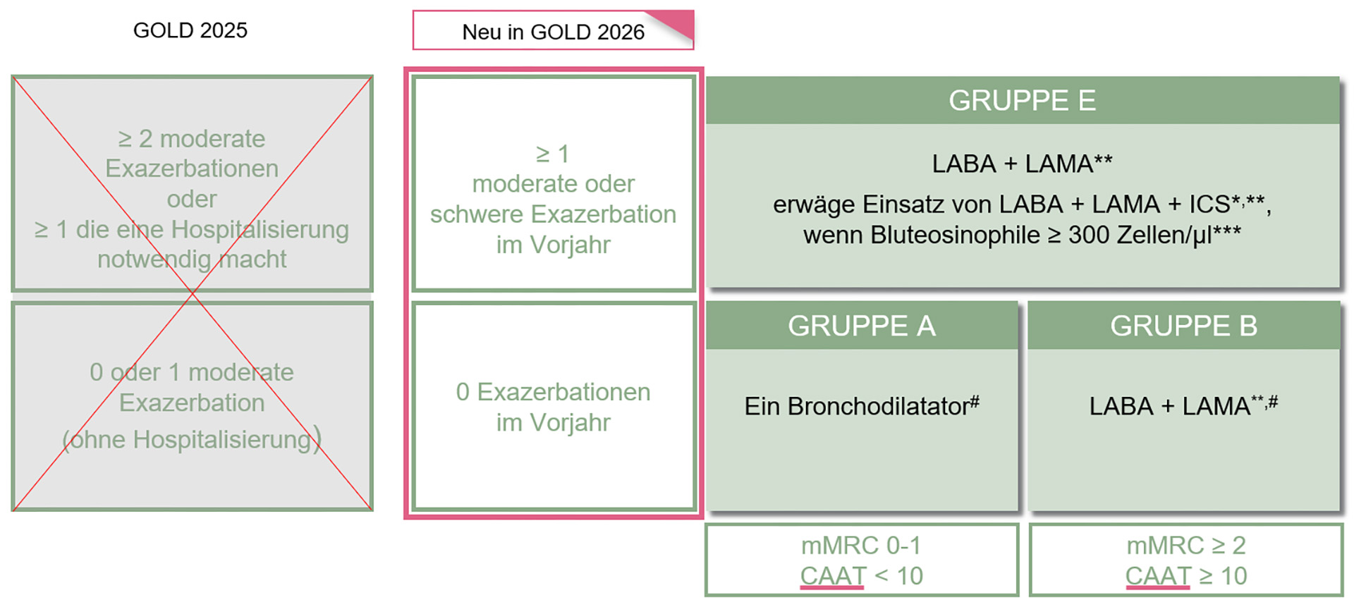 Diese neue Empfehlung hat zu entsprechenden Anpassungen in den Therapiealgorithmen und zu umfänglichen Updates und Erweiterungen des Kapitels „Management of Exacerbations“ (Management von Exazerbationen) geführt.