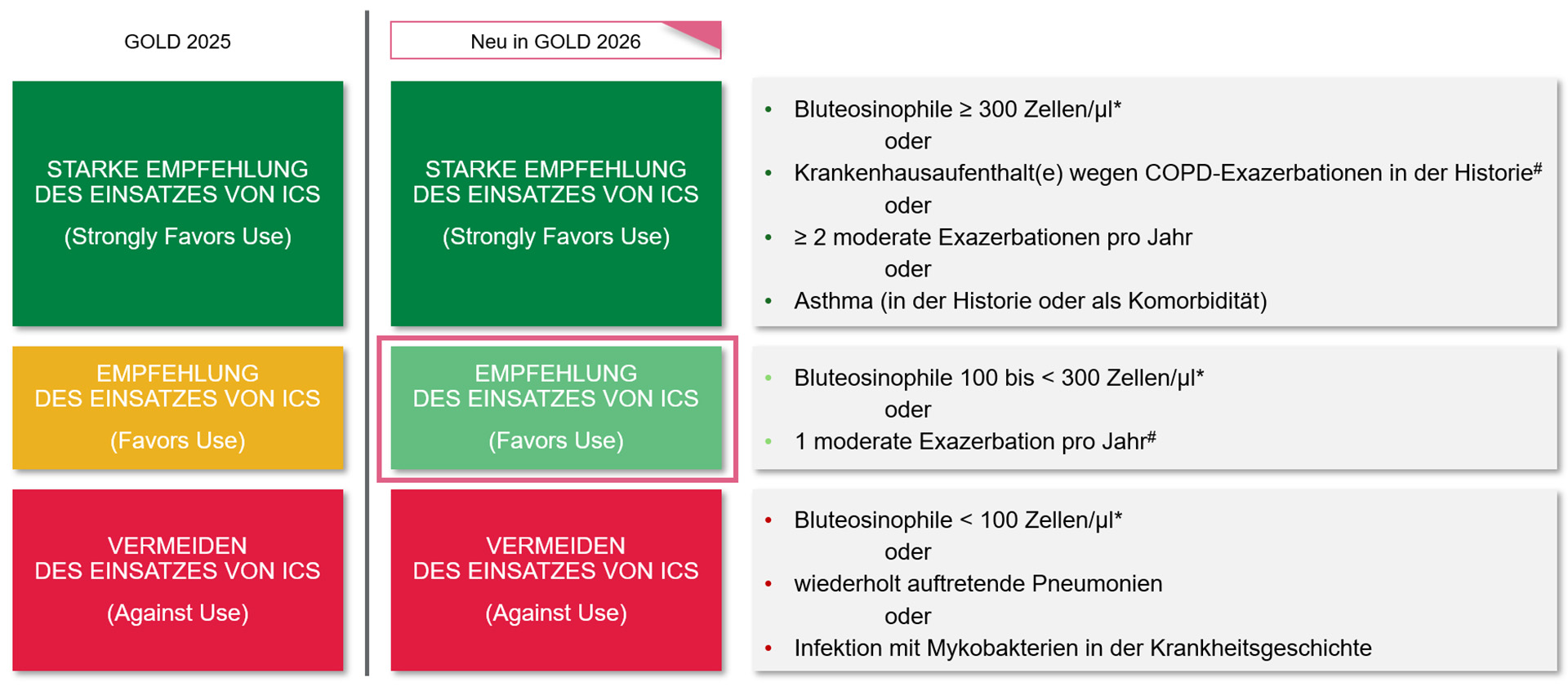 - GOLD bekräftigt die Empfehlung für den ICS-Einsatz ab 100 Zellen/µl Bluteosinophilen und/oder einer moderaten Exazerbation, ersichtlich an der Farbänderung „Favour use“ von gelb zu hellgrün (siehe Abb. 3). [GOLD-Report Abbildung 3.10., S. 67]