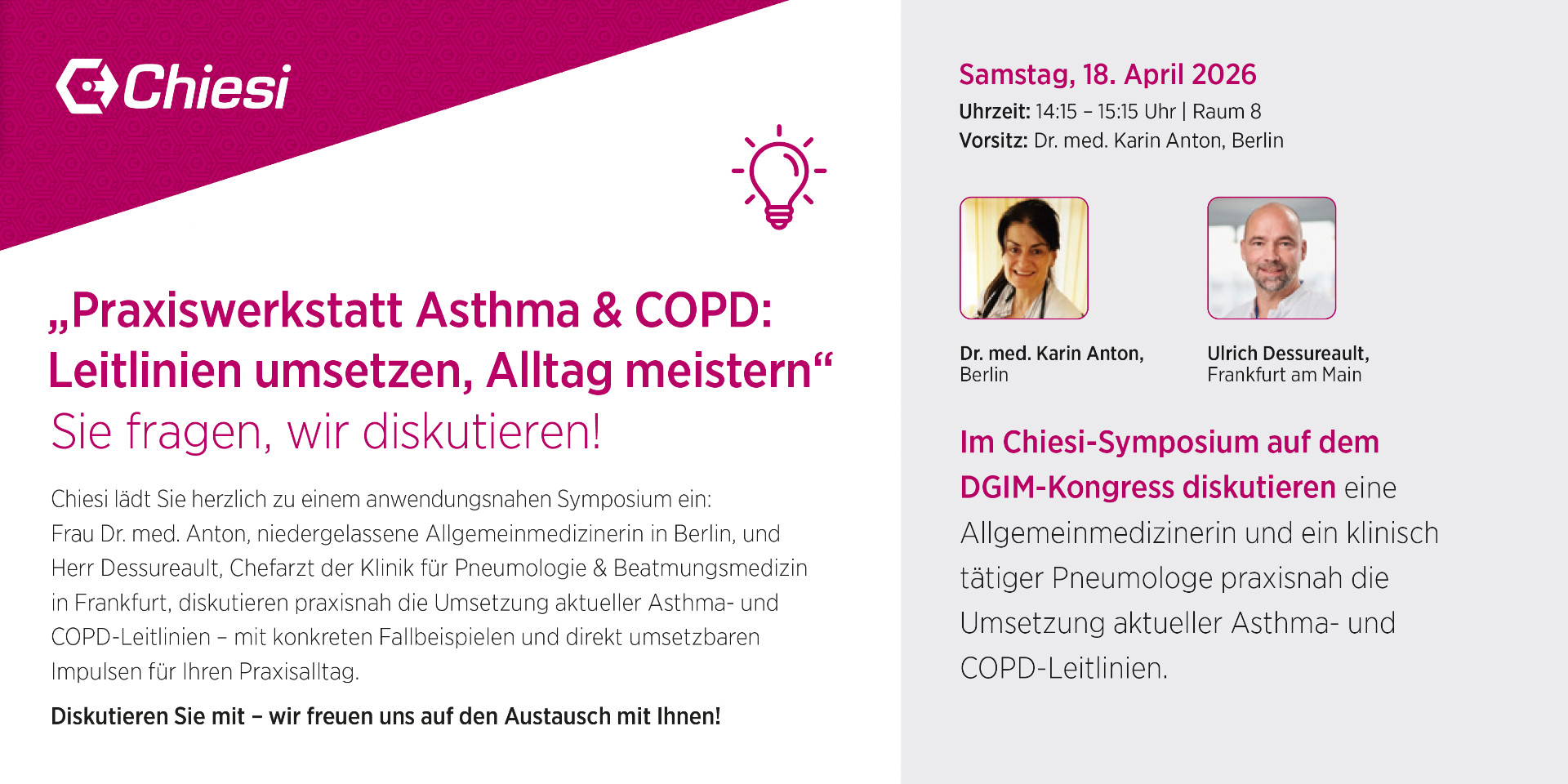 Frau Dr. med. Anton, niedergelassene Allgemeinmedizinerin in Berlin, und Herr Dessureault, Chefarzt der Klinik für Pneumologie & Beatmungsmedizinin Frankfurt, diskutieren praxisnah die Umsetzung aktueller Asthma- und COPD-Leitlinien – mit konkreten Fallbeispielen und direkt umsetzbaren Impulsen für Ihren Praxisalltag.